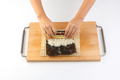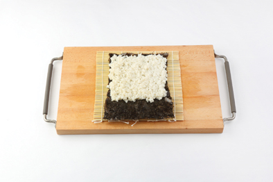 5) Place laver with smooth side on top onto a bamboo mat. Place 1 cup of seasoned rice at the center of laver and spread onto laver except top 1/4 part of laver.