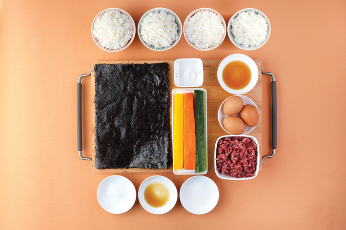 4 bowls of white rice (920g), 1 tsp. salt, 2 tbs. sesame oil, 4 sheets of roasted laver, 200g minced beef, 4 strips of pickled radish (90g), 2/3 cucumber (100g), 1/2 carrot (100g), 3 eggs, vegetable oil, salt and sesame oil