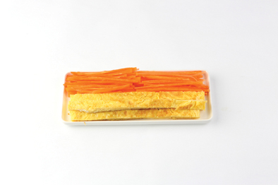 4) Salt finely julienned carrot, stir-fry and allow it to cool. Beat salt into eggs and make a thick omelet. Like other ingredients, cut into a pencil-sized width.