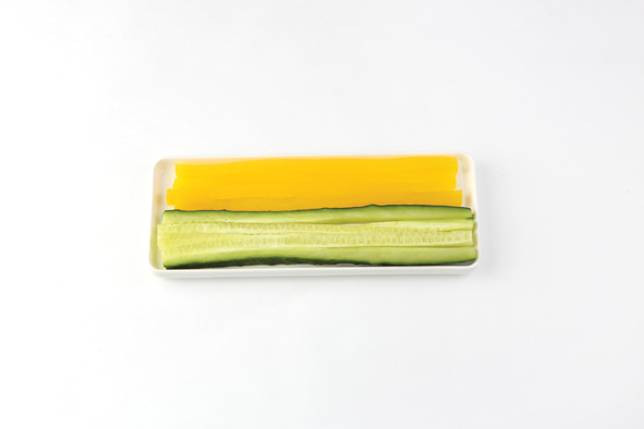 3) Cut pickled radish in thickness of a pencil in the length of laver. Cut cucumber in the same length and thickness as pickled radish. Soak cucumber in vinegar-sugar-salt water for 30 minutes, then remove moisture.