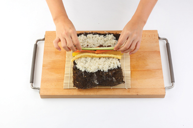 *Tips. Properly cooking rice is especially important in making Gimbap. The rice in Gimbap should be cooked over small amount of water. Sometimes rice is seasoned only with salt or sometimes with vinegar, sugar and salt. When performing step 7 above, be careful not to place too much rice. According to taste, add kimchi, cheese or salad to make a special Gimbap.