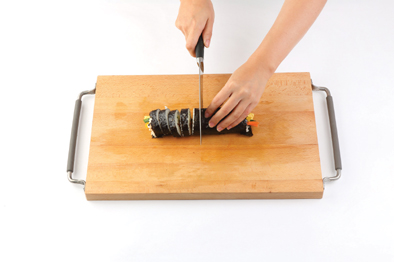8) Apply sesame oil onto knife and cut Gimbap round in 1cm thickness.