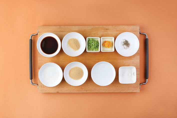 Meat Marinating Seasoning2 tbs. soy sauce, 1/2 tbs. sugar, 1 tbs. chopped green onions, 1 tsp. ground garlic, black pepper, 2/3 tbs. vinegar-sugar-salt water, 2/3 tbs. sugar, 2/3 tbs. water, salt