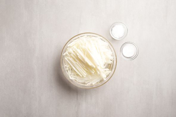3. Place the radish stripes in bowls and sprinkle with salt & sugar and leave it for 10 minutes to marinate the radish in salt & sugar.