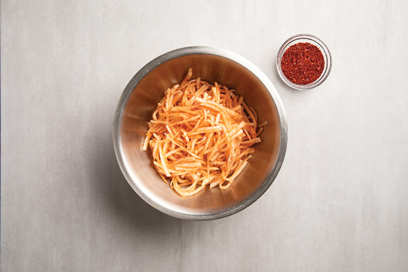 4. Throw away the salted and sugary water and season the marinated radish with chili powder.