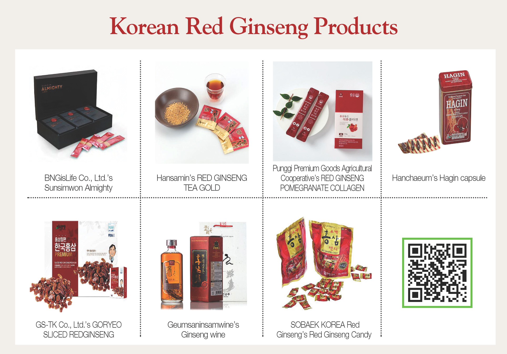 In Korea, ‘the birthplace of red ginseng,’ you can find red ginseng products from various companies. In addition to the well-known CheongKwanJang, there are BNGisLife Co., Ltd., Hansamin, and Punggi Premium Goods Agricultural Cooperative. BNGisLife sells Sunsimwon Almighty, which is mixed in liquid such as water, and Punggi Premium Goods Agricultural Cooperative sells Red Ginseng Pomegranate Collagen, which has removed the bitter taste of red ginseng. There is even red ginseng juice for children, which can be purchased at Organic Love. If you like red ginseng candy, contact Sobaek Korea.
