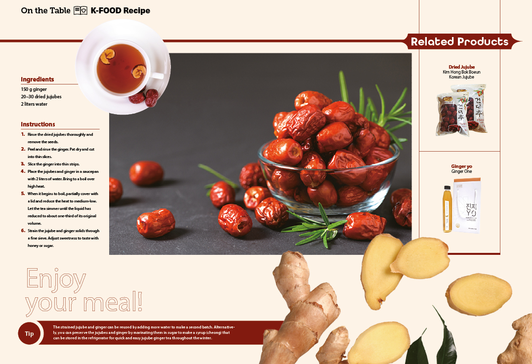 Korean jujube ginger tea is a traditional beverage made by simmering jujubes and ginger to create a delicious tea packed with health benefits. Jujubes are rich in vitamin C and beta-carotene, which support immune health, while ginger promotes circulation and helps prevent colds. Known for its warming properties, jujube ginger tea is especially popular as a soothing homemade remedy during Korea’s colder months. Why not enjoy this invigorating tea to stay warm and healthy this winter?