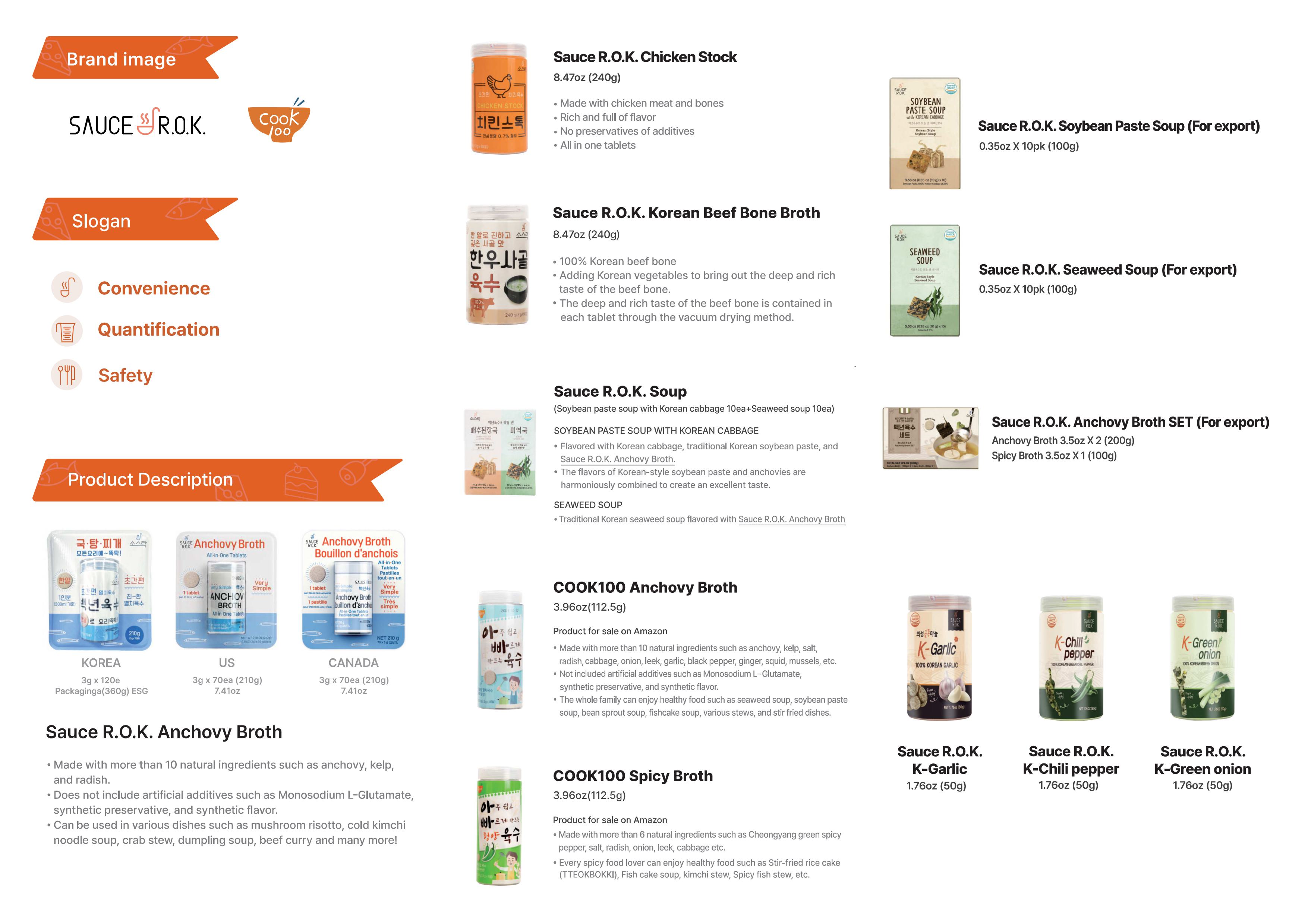 Sauce R.O.K. Chicken Stock8.47oz (240g) [3g X 80ea] *Chicken stockpowder(USDA approved) *Made with over chicken meat and bones *Rich and full of flavor *No preservatives of additives *HOW TO USE : 1 tabletper 8.45fl, oz, (250ml) of water *FSSC22000 Certification